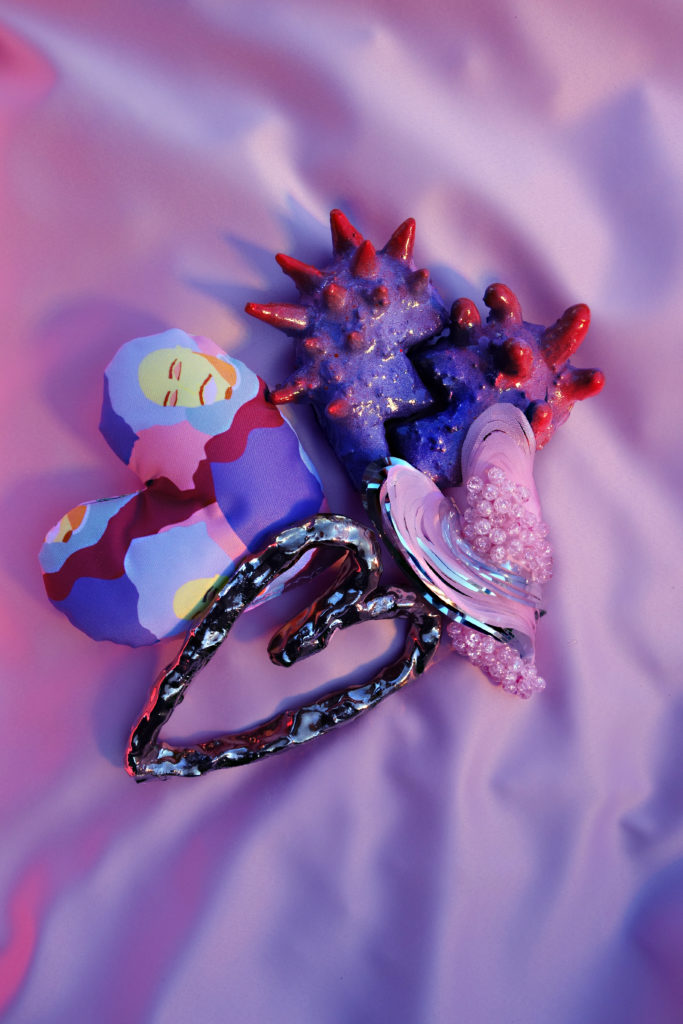 Les céramiques de Margot donnent à voir de nouveaux symboles emblématiques et de nouvelles icônes : les doigts et cœurs s’entremêlent et les étoiles enfantines se parent de visages grinçants. Richard compose le tableau d’une vie rêvée d’un personnage à son réveil, ainsi qu’une installation textile en souvenir d’une vie passée en hommage à sa grand-mère. À travers son miroir en lambeaux serti de perles et son costume hybride de fourrure et de velours, Lucas imagine ses mues et celles de ses ami·es, questionnant ces identités multiples. Louise-Margot présente un ensemble de sculptures oniriques en résine et silicone, inspirées des décors domestiques de son enfance, évoquant la fragilité de la mémoire et des