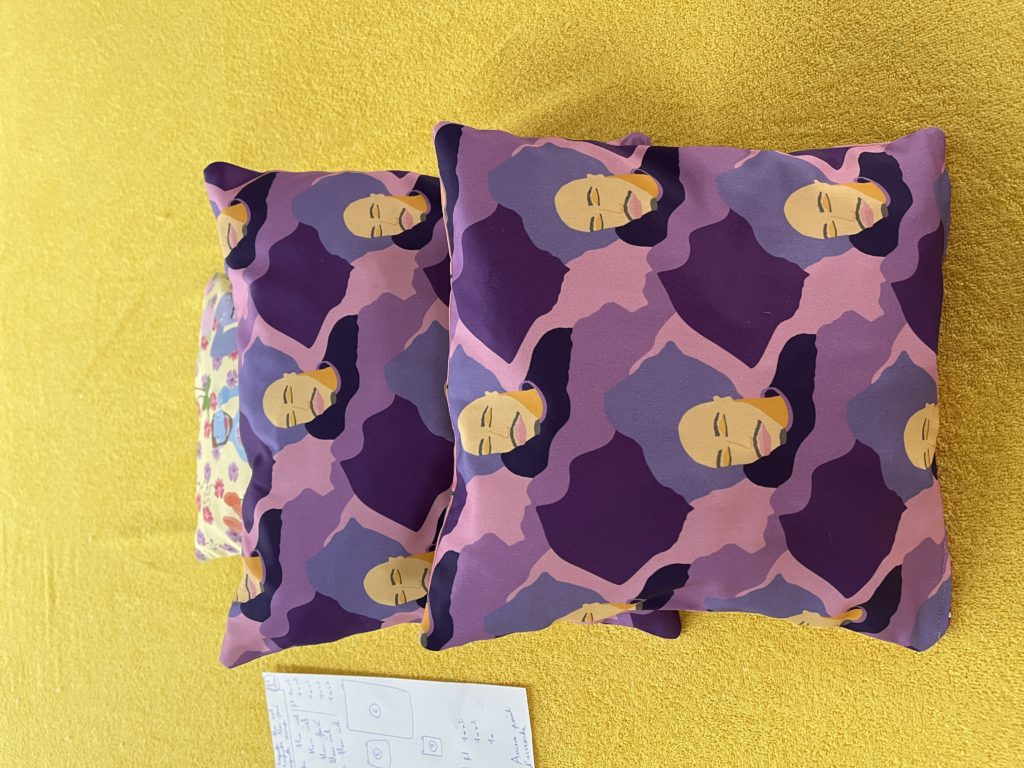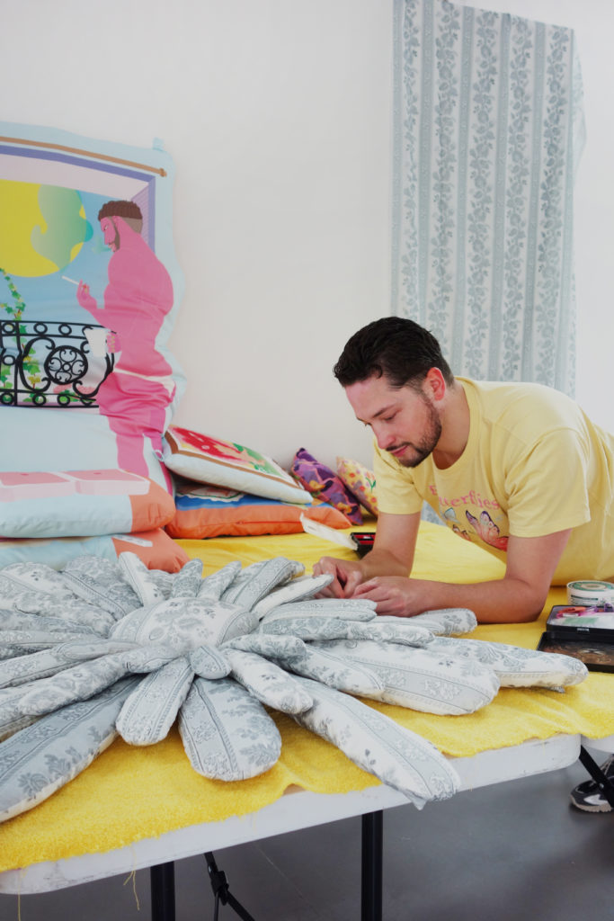 On ressent une tension entre ce qui nous paraît familier et ce qui s’éloigne pourtant du réel. La plupart des formes s’inspirent des objets que l’on retrouve chez soi : portail, miroir, lampe, lit et coussins. Mais ce mobilier n’a pourtant rien de commun. Leurs designs hors normes racontent le lien affectif que chacun·e des artistes entretient avec l’espace domestique. Le choix des textiles autant que celui des symboles vient témoigner d’histoires intimes, souvent familiales.